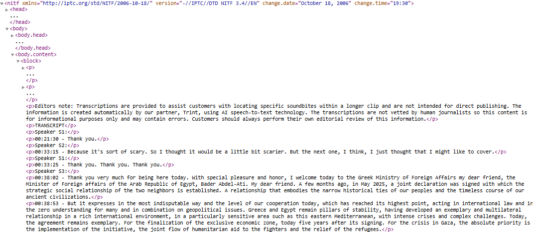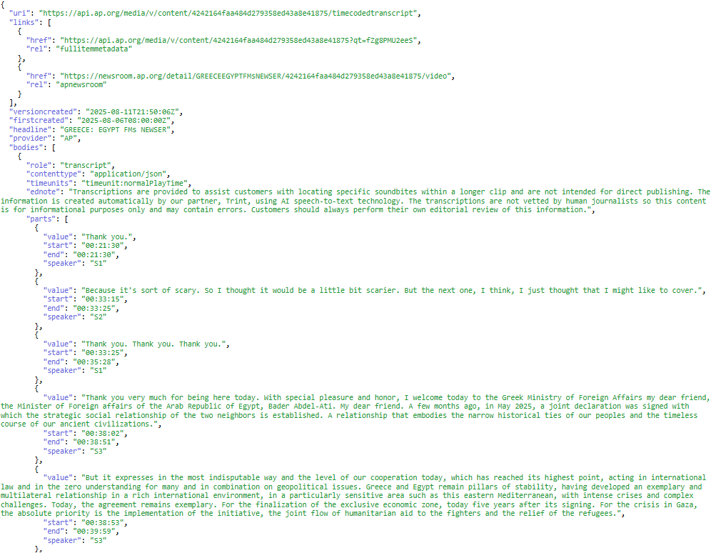 About timecoded transcriptsIn addition to the traditional NITF-formatted script renditions for video, Media API and Agent deliver timecoded video transcript renditions in the JSON and NITF formats when available. A timecoded transcript provides the text of all the dialog in the video tagged with the time references. Make sure to review the editor's note in the transcript file for important information about the AI-generated transcriptions. Example 1: Timecoded transcript in the JSON format